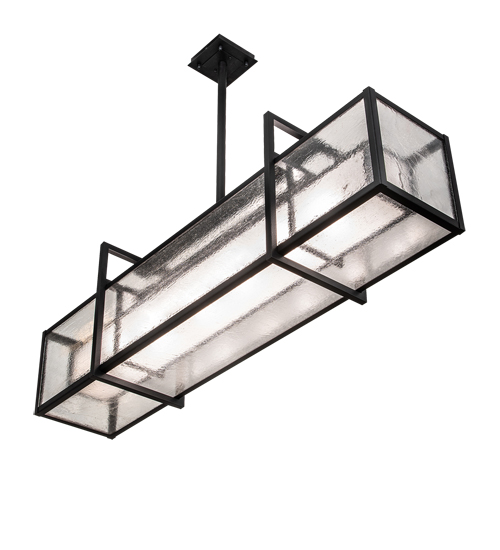 A sleek architectural structure in light. The Nelson oblong pendant is designed with a Clear Seeded Glass shade which is complemented by an elaborately structured frame finished in Black Satin Wrought Iron. The oblong fixture is ideal for illuminating a billiard table, kitchen island, counter, bar, reception area and other spaces. The Nelson Oblong Pendant is included in our American made, American designed Modern Lighting Collection. Manufactured in Yorkville, NY. UL and cUL listed for dry and damp locations.
