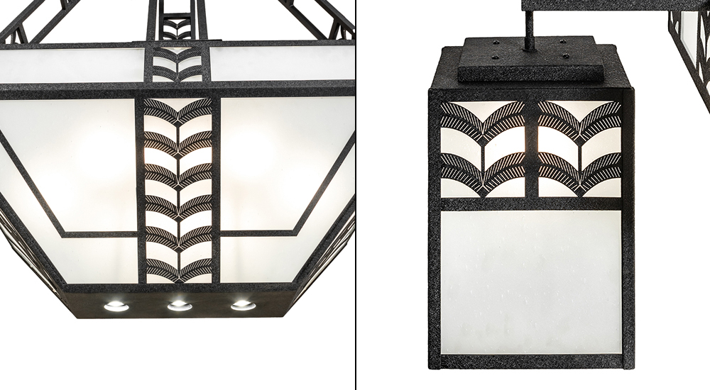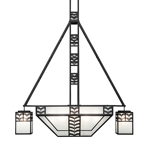 This striking geometric multifaceted form is inspired by Mission and Craftsman styles from the early 20th century. This unique oblong chandelier features an inverted shade with Frosted Seeded Glass and laser-cut Feather Accents integrated with a geometric pattern. Black Cracked Ice finished accents adorn the main shade and the two rectangular shaped shades flanked on each side and the supporting frames. 12 inner lamps bring out the beauty of the glass while 3 downlights deliver functional illumination on surfaces below. The Monaca Chandelier is featured in our American made, American designed, handcrafted Mission Lighting Collection. Manufactured in Yorkville, New York. UL and cUL listed for dry and damp locations.