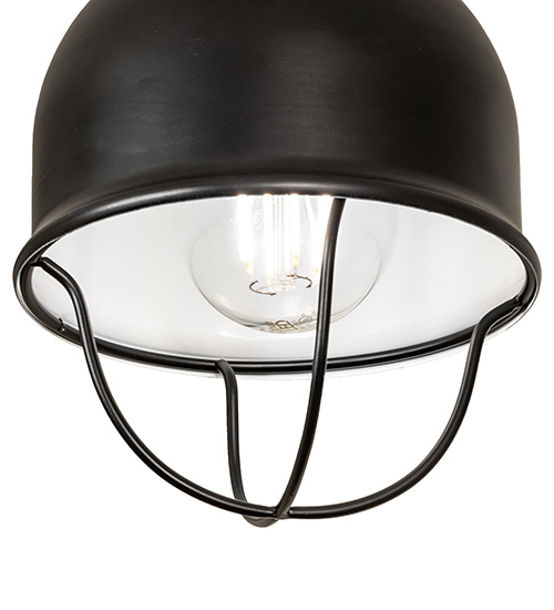 A dramatically styled pendant. Gravity Golpe features a dome-shaped shade that is hand finished in Black Galvanized powder coat and strikingly set on the outer surface, amazingly contrasting against a White internal metallic finish. The richly appointed interior results in a warm, burnished glow from an energy efficient LED lamp. The pendant features a Metal Cage to protect the diffuser and create a unique industrial aesthetic. The overall height ranges from 8 to 84 inches as the cord length can be adjusted in the factory. The Gravity Golpe Pendant is featured in our American designed, handcrafted Industrial Lighting Collection. UL and cUL listed for dry and damp locations.