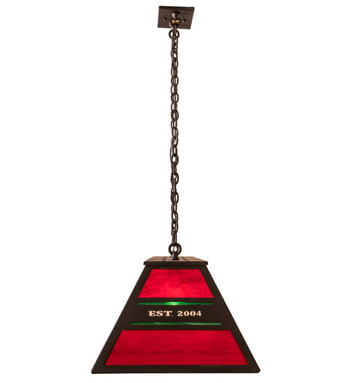 Designed with the SAPATA LODGE name. This stunning personalized oblong pendant features a shade that combines Red, Green, and White art glass and is complemented with a Costello Black finish. This oblong pendant is ideal for illuminating billiard tables, bars, kitchen islands, counters, and dining tables. The overall height ranges from 22 to 48 inches, as the chain can easily be adjusted in the field to your exact specifications. The Personalized Sapata Lodge Oblong Pendant is included in the American-made, American-designed, handcrafted Personalized Collection and manufactured in Yorkville, New York. UL and cUL listed for dry and damp locations. This specific fixture is not available for sale but is shown as is to demonstrate our custom capabilities. Please feel free to contact us for more info. Featured in a private residence in the central Adirondacks in New York state.