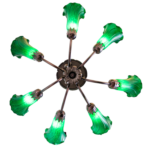 Recreating the popular Tiffany design from the early 1900s... This classic chandelier offers a delicate design featuring 7 stunning shades created using Green Favrile art glass with the famous Meyda Tiffany copperfoil construction technique. An elegant cast metal frame features a Mahogany Bronze finish. Overall height ranges from 18 to 53 inches as the chain easily adjusts in the field. The Pond Lily Chandelier is included in our American-designed, handcrafted Favrile Glass Lighting Collection. UL & cUL listed for dry and damp locations. Each shade is a unique work of art with color variations based on natural ingredients inherent in the glass. Please feel free to contact us if color matching is critical when ordering multiple items.