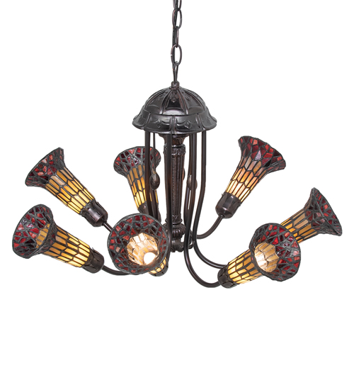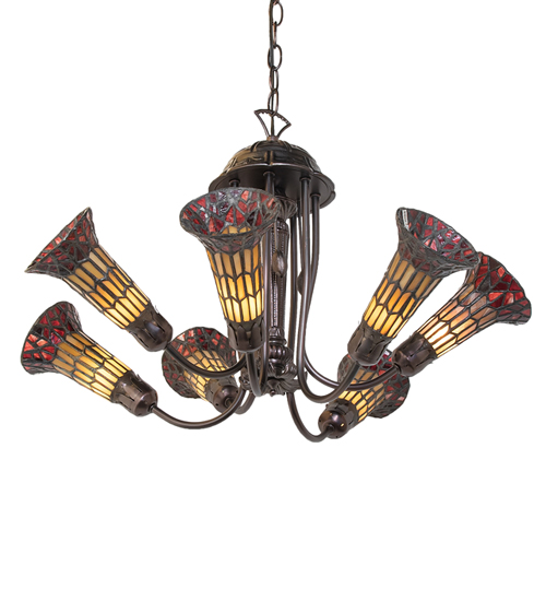 Inspired by the popular Tiffany design from the early 1900s... This classic chandelier features 7 stunning shades created using Honey and Red art glass with the famous Meyda Tiffany copperfoil construction technique. An elegant curvaceous cast metal frame features a Mahogany Bronze finish. The overall height ranges from 18 to 53 inches as the chain easily adjusts in the field. The Pond Lily Chandelier is included in our American-designed, handcrafted Stained Glass Lighting Collection. UL and cUL listed for dry and damp locations. Each shade is a unique work of art with color variations based on natural ingredients inherent in the glass. Please feel free to contact us if color matching is critical when ordering multiple items.