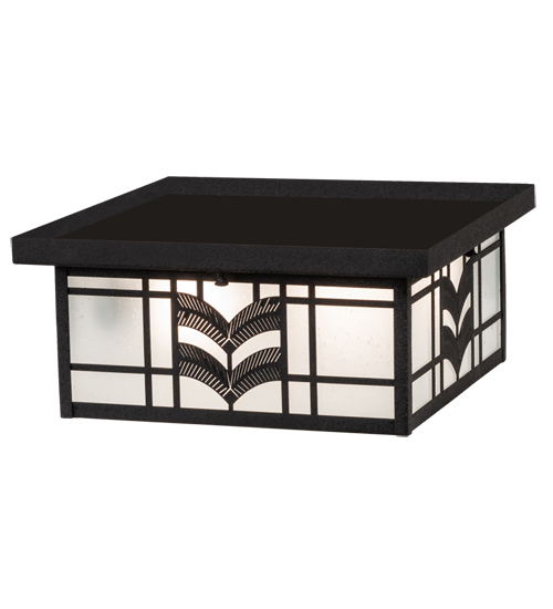 This striking geometric form is inspired by Mission and Craftsman styles from the early 20th century. This unique ceiling fixture features a shade with Frosted Seeded Glass and laser-cut Feather Accents integrated with a geometric pattern. Black Cracked Ice finished accents adorn this stunning ceiling luminaire. The Monaca Flushmount is included in our American made, American designed, handcrafted Mission Lighting Collection. Manufactured in Yorkville, New York. UL and cUL listed for dry and damp locations.