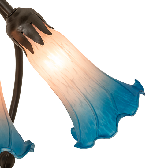 Recreating the popular Tiffany design from the early 1900s... This table lamp offers an attractive, delicate design featuring three stunning Pink and Blue art glass shades. The Pond Lily shades are embraced by an elegant cast metal base that is finished by hand in Mahogany Bronze. The Pond Lily Mini Lamp is featured in our American designed, handcrafted Favrile Style Glass Lighting Collection. Each shade is a unique work of art with color variations based on natural ingredients inherent in the glass. Contact us if color matching is critical when ordering multiple items.