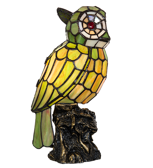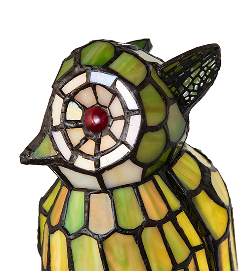 A beautiful representation of the Wise Majestic Owl, this charming accent lamp symbolizes transformation, intuitive development, good luck, and self-actualizations. This lighted art glass sculpture is created using the famous Meyda Tiffany copperfoil construction technique in Amber, Green, and Pink art glass, accented with Red Jewel eyes. The figure sits on a stunning cast metal base designed as a Turtle and finished in Black with Gold Highlights. Ideal as an illuminating accent piece for placement on mantels, credenzas, occasional tables, and other spaces in residential and hospitality settings. Inspired by Owls throughout the US, from Santee and Hardeeville, South Carolina, to Cook County, Illinois, to Portland, Oregon, to Redwood National and State Parks throughout California. The Owl Accent Lamp is included in our American-designed Stained Glass Collection. UL and cUL listed for dry locations. Each lamp is a unique work of art with color variations based on natural ingredients inherent in the glass. Please contact us if color matching is critical when ordering multiple items.