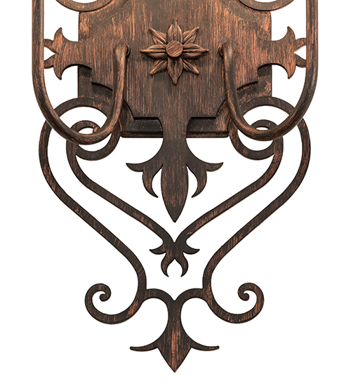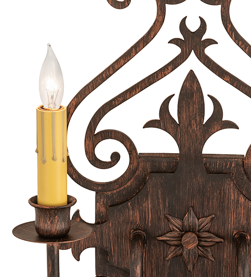 Gothic revival combined with a Fleur-de-lis inspired motif. Romantic elegance is captured with Cimarron Bronze finished accents and frame. The ornate hardware is enhanced with two Ivory faux candlelights perched on complementary bobeches. The Louisa 2 Light Wall Sconce is featured in our American-manufactured, American-designed, handmade Traditional Lighting Collection. Manufactured in the USA. UL & cUL listed for dry and damp locations.