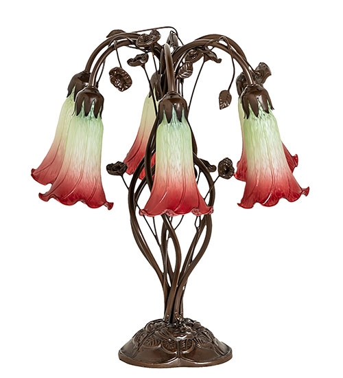 Inspired by the famous Tiffany design from the early 1900s... This table lamp features six stunning Seafoam and Cranberry mouth-blown art glass shades that are are embraced by an elegant Cast Metal Base featuring a rich Mahogany Bronze finish. The Pond Lily Table Lamp is included in our American designed, handcrafted Favrile Glass Lighting Collection. UL and cUL listed for dry locations. Each shade is a unique work of art with color variations based on natural ingredients inherent in the glass. Contact us if color matching is critical when ordering multiple items.