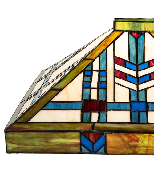 In the tradition of the Prairie School, organic objects were interpreted into geometric forms. Meyda Tiffany uses colorful interlocking blocks of Willow Green, Sunrise Amber and Bark Brown granite glass to form stylized wheat stalks on a Beige Cream background, with Red and Blue accents. The stained glass shade is created using the famous Meyda Tiffany copperfoil construction. Pair shade with a base to create a table or floor lamp, or match with hardware to build wall and ceiling fixtures. The Prairie Wheat Shade is featured in our American designed, handcrafted Prairie Lighting Collection. Each piece is a unique work of art with color variations based on natural ingredients inherent in the glass. Contact us if color matching is critical.