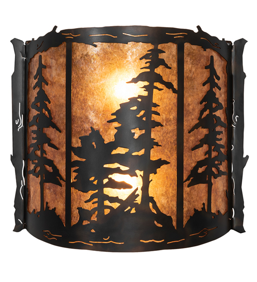 This stunning wall sconce features mesmerizing Tall Pine Trees and woodland metal silhouettes. Beautiful ambient light is projected in an Amber Mica curvaceous shade complemented with a Dark Burnished Antique Copper finish. The Tall Pines Wall Sconce is included in our American-made, American-designed, handcrafted Nature-Inspired Lighting Collection. Manufactured in Yorkville, New York. UL and cUL listed for dry and damp locations.