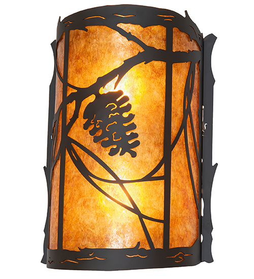 Invite the beauty of nature into your home with a charming wall fixture featuring metal accents designed as Pinecones, Pine needles, and branches. Experience the warm beauty of an Amber Mica diffuser enhanced with an Oil Rubbed Bronze finish. The sconce complements the matching center sconce 261022 and right sconce 261020. The Whispering Pines Left Wall Sconce is featured in our American-made, American-designed, handcrafted Nature Inspired Collection. Manufactured in Yorkville, New York. UL and cUL listed for dry and damp locations.