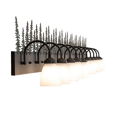 This stunning, extensive vanity light features mesmerizing Green Hand-painted Pine Tree metal silhouettes that stand tall on this fixture. Functional downlighting is projected through 10 curvaceous White Glass shades complemented with an extensive backplate in a Textured Black finish. Ideal as a vanity light in a fine bath or as a charming wall sconce in a corridor or other space in residential, commercial, and hospitality settings. It was inspired by pine trees, from the Sawtooth National Forest in Idaho and Utah, to the Sierra National Forest in California and Nevada. The Tall Pines Vanity Light is included in our American-made, American-designed, handcrafted Nature Inspired Lighting Collection and manufactured in Yorkville, New York. UL and cUL listed for dry and damp locations.