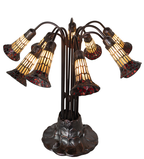 Inspired by the famous Tiffany design from the early 1900s. This table lamp features 10 stunning Honey and Red stained glass shades created using the famous Meyda Tiffany copperfoil construction technique. An elegant cast metal Lily pad base embraces the shades with fitters finished by hand in Mahogany Bronze. The Tiffany Pond Lily Light Table Lamp is included in our American-designed, handcrafted Stained Glass Lighting Collection. UL and cUL listed for dry locations. Each shade is a unique work of art with color variations based on natural ingredients inherent in the glass. Please contact us if color matching is critical when ordering multiple items.
