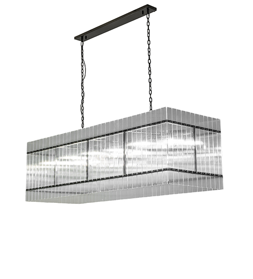 This stunning oblong ceiling pendant features a classic design revealing dozens of Clear Reeded Glass panels. The Andreas Pendant offers a handsome Gunmetal finished frame. This massive but elegant fixture is perfect for installation above dining tables and islands in homes and restaurants from Montpelier, Vermont, to Baton Rouge, Louisiana, to Salem, Oregon. The overall height ranges from 24 to 64 inches, as the chains can be easily adjusted in the field to meet your lighting requirements. The Andreas Pendant is included in our American-designed, handcrafted Modern Farmhouse Collection. UL and cUL listed for dry and damp locations. Custom Made. Call for lead time and pricing.