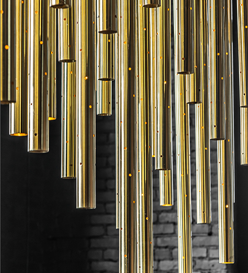 This massive, elegant pendant features a dazzling array of 63 cascading Polished Brass finished cylinders with perforated voids that adhere to a Solar Black finished canopy above. Like shining stars overhead, 15 of these elements emit dramatic beams of warm 3000K ambient light that dim beautifully with a 0-10V system. Each cylinder features one downlight with Integral LEDs projecting light from within. The overall height ranges from 42 to 96 inches, as the Black cord and cable length can be adjusted in the factory to accommodate your specific lighting application needs. The massive pendant is perfect for foyers, lobbies, reception areas, and other spaces in large residences, hotels, and restaurants, from Boston, Massachusetts, New York, New York, to San Francisco, California. The Emmentaler Cascading Pendant is featured in our American-made, American-designed, handmade Modern Lighting Collection and manufactured in Yorkville, New York. UL and cUL listed for dry and damp locations. Featured within the new home of Utica, New York's award-winning Tailor and the Cook Restaurant.