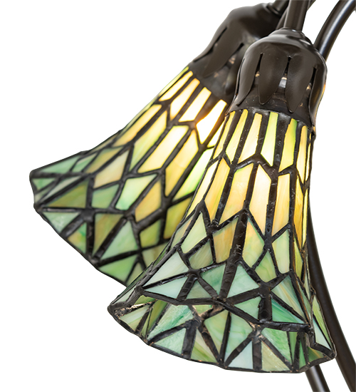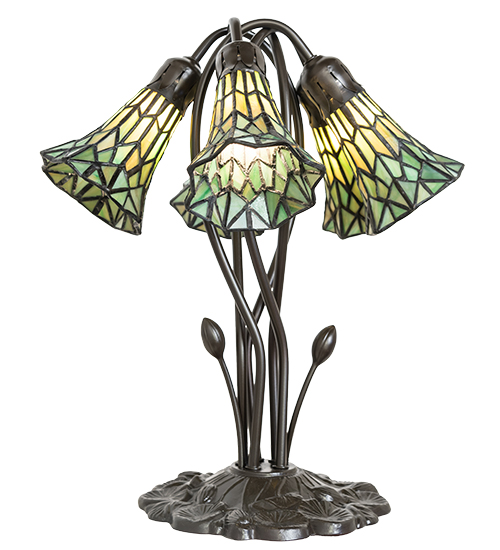 Inspired by the famous Tiffany design from the early 1900s. This table lamp features five stunning Amber and Green stained glass shades created using the famous Meyda Tiffany copperfoil construction technique. An elegant cast metal base with winding vines and a lily pad embraces the shades with fitters finished by hand in Mahogany Bronze and inspired by antique lighting in homes from the Bowery in New York City, to Philadelphia, Pennsylvania, to San Francisco, California. Ideal for placement near a chair or table in living spaces, dining areas, and other settings in hospitality and residential settings. The Stained Glass Pond Lily 5 Light Table Lamp is included in our American-designed, handcrafted Stained Glass Lighting Collection. UL and cUL listed for dry locations. Each shade is a unique work of art with color variations based on natural ingredients inherent in the glass.