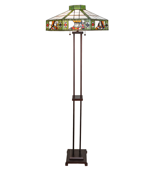 Play your cards right with this winning-hand poker lamp, a Meyda original. The high cards are etched and inlay painted in symbols of Black Spade & Club and Red Heart & Diamond on a White and Green art glass background. The shade is created with the famous Meyda Tiffany copperfoil construction process. The base is enhanced with hand-finished Mahogany Bronze. This charming floor lamp is ideal for illuminating living spaces, foyers, and other residential, hospitality, and commercial spaces throughout the US, including Atlantic City, Reno, and Las Vegas, Nevada. The Poker Face Floor Lamp is featured in our American-designed, handcrafted Fun & Games Lighting Collection. UL and cUL listed for dry locations. Each shade is a unique work of art with color variations based on natural ingredients inherent in the glass.