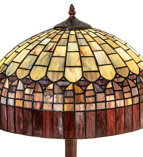 In the early 20th century, Tiffany Studios used it's artful mastery to develop the look of a woven fabric with a fringed skirt from art glass. Meyda Tiffany has recreated this shade with Amber Plum glass fringe suspended from a domed brickwork of Emerald, Cobalt and Ruby tinted Honey glass. Hand cut and copper foiled glass pieces make up this stately table lamp with Mahogany Bronze finish.