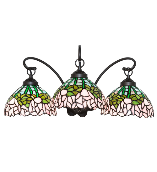 A wreath of full blooming Passion Pink cabbage roses circles beautiful stained glass shades, recreating a design by the Louis Comfort Tiffany studio. Bronzed Green leaves and stems form a pattern against an Opal sky in this lovely wall sconce. 3 stunning shades are constructed with the famous Meyda Tiffany copperfoil technique and enhanced with an elegant cast metal wallplate finished in a warm Mahogany Bronze. The Tiffany Cabbage Rose 3 Light Wall Sconce is included in our American-designed, handcrafted Tiffany Reproduction Collection. UL & cUL listed for dry and damp locations. Each shade is a unique work of art with color variations based on natural ingredients inherent in the glass. Please feel free to contact us if color matching is critical when ordering multiple items.