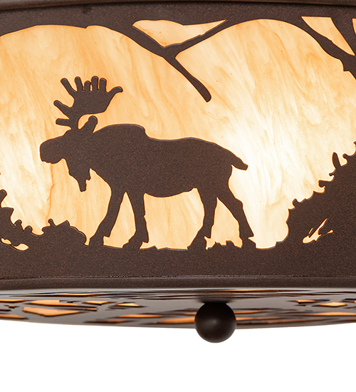 Bring natural beauty into your home with this majestic Moose meandering through the woodlands beneath stunning winter tree silhouettes. This wildlife-adorned ceiling fixture is artistically designed with a gorgeous Ambra Siena Idalight lens and hardware featuring a Cafe Noir finish. This handsome fixture will warm your home and your heart. The fixture is inspired by Moose, which roam popular parks, including the Isle Royale National Park in Michigan, Rocky Mountain National Park in Colorado, and Glacier National Park in Montana. The fixture is perfect for illuminating man caves, she sheds, trophy rooms, dens, and other residential, hospitality, and commercial spaces. The Moose at Dawn Flushmount is featured in our American-made, American-designed, handcrafted Wildlife Lighting Collection, which is manufactured in Yorkville, New York. UL & cUL listed for dry and damp locations. Upstate New York's adventurous playland, known as the Adirondack Mountains, with its many breathtaking forests, lakes, and rivers, is the spiritual birthplace of Meyda and inspires our rustic-themed glass collections.
