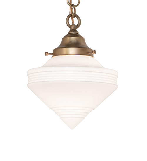 The Revival Schoolhouse glass reflects an authentic classic design. A perfectly formed Deco Cone shade features a spinning top design and handcrafted White Opal Schoolhouse Glass with rich artisanship and style originally used in private residences, schools, galleries and libraries. The Brushed Brass pendant has an overall height ranging from 18 to 52 inches, as the chain can be easily set in the field. The Revival Schoolhouse Deco Cone Globe Mini Pendant is included in our American-designed, handcrafted Schoolhouse Lighting Collection. UL and cUL listed for dry and damp locations.