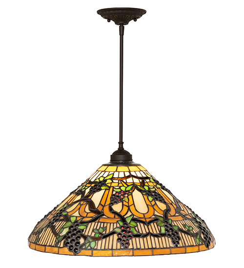 Bring sunny vineyards to your home or business with this lovely Meyda Original pendant. Radiant Concord Purple jewels, Vineyard Green leaves, and glistening dew-kissed Bark Brown vines wrap around a Golden Sunshine banded shade. The art glass shade is created using the famous Meyda Tiffany copperfoil construction process. The fixture is enhanced with an Oil Rubbed Bronze finish. The overall height can be adjusted by combining the four stem lengths included: 9-inch, 15-inch, 19-inch, and 27-inch in any combination to achieve the desired drop from the ceiling. The Jeweled Grape Pendant is featured in our American-designed, handcrafted Stained Glass Collection. UL and cUL listed for dry and damp locations. Each shade is a unique work of art with color variations based on natural ingredients inherent in the glass.