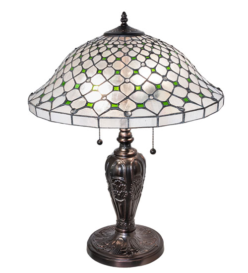 The Clear Glass art glass shade features sparkling Emerald Diamond-shaped accents and Jewel droplets in this elegant Victorian-style shade. The beautiful table lamp features a stained glass shade created using the famous Meyda Tiffany copperfoil construction technique. The elegant cast metal lamp base is hand finished in warm Mahogany Bronze. It is ideal as an illuminating accent piece on a credenza, occasional table, and other spaces in residential and hospitality settings. This lighting design is inspired by diamonds in fine jewelry retailers from Fifth Ave in New York City, Palm Beach Gardens in Florida, to Rodeo Drive in Beverly Hills, California. The Diamond & Jewel Table Lamp is included in our American-designed, handcrafted Stained Glass Lighting Collection. UL and cUL listed for dry locations. Each shade is a unique work of art with color variations based on natural ingredients inherent in the glass.