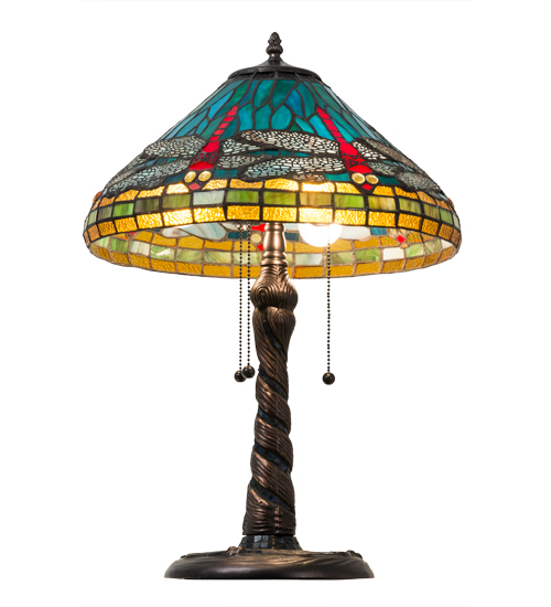 Inspired by Tiffany Studio's beloved stained glass Dragonfly design, this table lamp is modeled after the original design. Diving Scarlet dragonflies, designed with glowing Amber-Yellow jeweled eyes and delicate metal filigree wings, circle over hand cut and copper foiled bands of Amber-Green and Golden colored glass, and Blue/Green leaves. The shade is created using Meyda Tiffany's famous copperfoil construction and complemented with a decorative twisted Dragonfly base finished in a warm hand applied Mahogany Bronze finish. The lamp, which is UL and cUL listed for dry locations, is available in custom colors, finishes and sizes. Dimmable energy efficient lamping options are available.