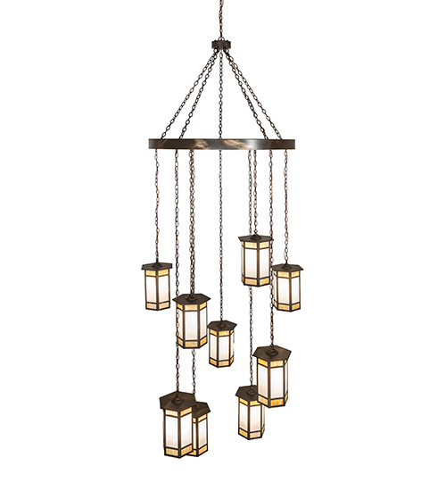 Designed with nine unique Craftsman-styled lanterns, this cascading pendant combines Beige Iridescent and White Art glass diffusers juxtaposed at various heights from a decorative frame in an Antique Brass Matte finish. This fixture is ideal for lobbies, entryways, foyers, and other rooms where you want to make a dynamic design statement. The overall height ranges from 138 to 170 inches as the chains can be adjusted in the field for various lighting applications and requirements. The Asbury Turret 9 Light Cascading Pendant.is featured in our American-made, American-designed, handcrafted Craftsman Lighting Collection and manufactured in Yorkville, New York. UL and cUL listed for dry and damp locations.