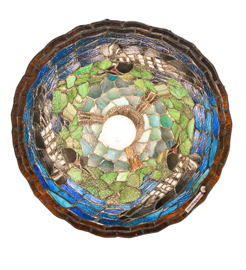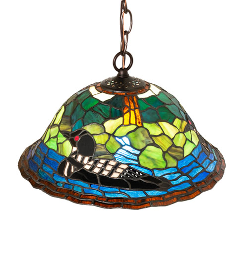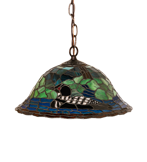 A stunning image of this aquatic bird floating on a lake near the woodlands is captured in Blue Ripple Glass against a landscape of various Green colors with a Bark Brown Ripple Glass tree to complement the shade's border. This wildlife-inspired shade was created using the famous Meyda copper foil construction process and is enhanced with a gorgeous, Nature-inspired base featured in a Mahogany Bronze embossed finish. The overall height ranges from 12 to 45 inches, as the chain length can be easily adjusted in the field to accommodate your specific lighting application needs. The Loon Table Lamp is included in our American-designed, handcrafted Wildlife Collection. UL and cUL listed for dry and damp locations.