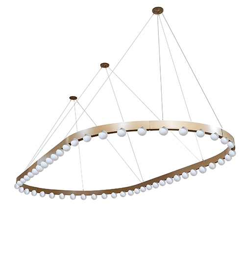 This architecturally styled, custom-designed lighting system is created with the latest technology and artisanship. This massive modern system offers a sophisticated, dramatic design for commercial, hospitality, and residential interiors, including lobbies, concourses, galleries, and offices. Innovation and elegant minimalism come to light with this unique monorail-styled luminaire system, highlighted with a stunning Honey Bucket powder-coated frame and hardware. The massive fixture features 52 illuminating globes that mount to the track, suspended with low-profile aircraft cables. The Indianapolis Oval 52 Light Chandelier is included in our American-made, American-designed, handcrafted Architectural Lighting Collection and manufactured in Yorkville, NY. UL and cUL listed for dry and damp locations. This fixture was designed by David Singer of Arc Light Design in New York and is Featured at the Wolfgang Puck Bar & Grill in the MGM Grand Hotel & Casino in Las Vegas.