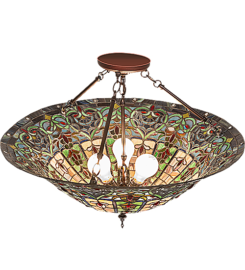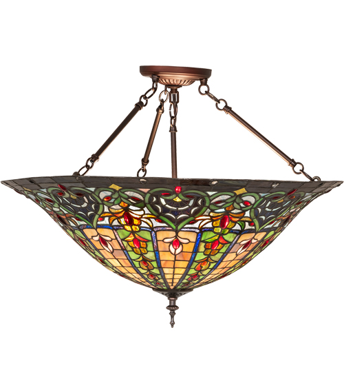 Bella features a beautiful, traditionally patterned shade in a plethora of colorful stained art glass crafted utilizing the famous Meyda copperfoil construction process to create this charming inverted pendant. Green glass heart-shaped designs crown a variety of decorative motifs in Amber, Blue, and Yellow, with Amber, Red, and Clear Glass jewel accents. The shade is suspended from hardware, which is hand-finished in Mahogany Bronze. The Tiffany Elizabethan Inverted Pendant is featured in our American-designed, handcrafted Stained Glass Lighting Collection. UL and cUL listed for dry and damp locations. Each shade is a unique work of art with color variations based on natural ingredients inherent in the glass. Custom Made. Call for pricing and lead time.