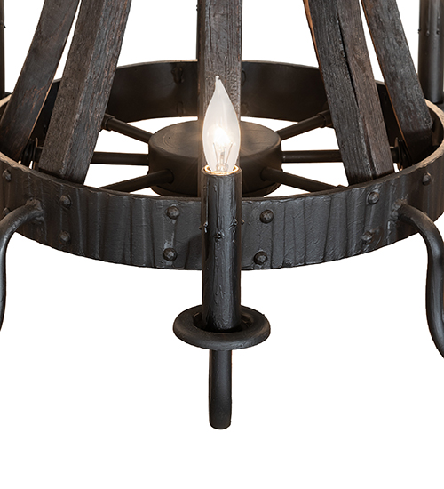 Elegant, luxurious charm blends with natural, rustic beauty. This extraordinary chandelier is inspired by antique staves traditionally bound by metal hoops used to construct beer and whisky barrels and wine casks. A stunning Hammered Charred Wood band and Black curved metal arms with bobeches embrace eight complementary faux candlelights for beautiful ambient illumination. This lovely chandelier is ideal for providing beautiful ambient lighting and opulence in residential and hospitality spaces. The overall height ranges from 31 to 66 inches, as the chain can be adjusted on location to meet your precise lighting requirements. The Barrel Stave Madera 8 Light Chandelier is included in our American-made, American-designed, handcrafted Contemporary Rustic Collection and manufactured in Yorkville, New York. UL and cUL listed U.L.dry and damp locations.