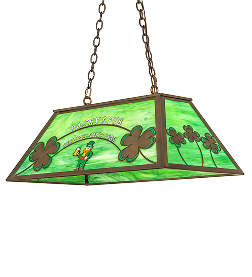 Designed with the PACKY'S PUB name and Serving Since 1985 with artwork featuring shamrocks and a leprechaun. This stunning personalized art glass oblong pendant features a Green art glass shade complemented with an Antique Copper finish. This oblong pendant is ideal for illuminating billiard tables, bars, kitchen islands, counters, and dining tables. The overall height ranges from 18 to 36 inches, as the chain can easily be adjusted in the field to your exact specifications. The Personalized Packy's Pub Oblong Pendant is included in the American-made, American-designed, handcrafted Personalized Collection and manufactured in Yorkville, New York. UL and cUL listed for dry and damp locations. This specific fixture is not available for sale but is shown as is to demonstrate our custom capabilities. Contact us for more info.