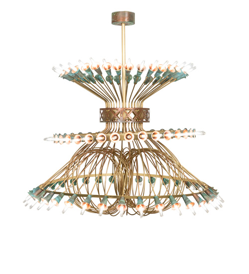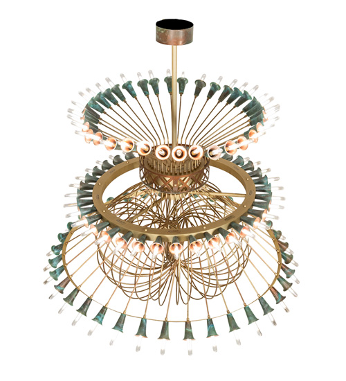 A magnificent masterpiece of Brass, Copper, and energy-efficient LEDs that speaks to drama, excitement, and celebration of beautiful lighting and design. Spring into action and select this innovative chandelier, which features organically bent Brass Tubing finished in Brushed Brass. Beautiful Verdigris Copper finished socket cups, designed like Trumpet Lily flowers, pair with 108 customer-supplied lamps throughout the fixture. This massive three-tiered chandelier is ideal for illuminating entryways, lobbies, and ballrooms in hotels and other commercial lighting installations. The canopy and decorative banding accents are crafted of Copper. This chandelier matches well with two complementary lighting fixtures: the 42 Wide Coyle 36 Light Semi-Flushmount, model 274854, and the 60 Wide Coyle 72 Light Chandelier, model 274991. The Coyle Chandelier is featured in our American-made, American-designed Coyle Chandelier Collection, which is manufactured in Yorkville, New York. UL and cUL listed for dry and damp locations. The fixture was created for The Memorymakers at Landmark Hospitality, which owns The Albion Summit in Summit, New Jersey.