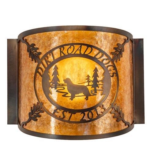 A stunning curvaceous wall sconce is personalized with the DIRT ROAD DOGS EST 2013 logo and graphics. A Dog stands among the Tall Pine trees across the perimeter of the shade, adorned with Oak leaves on the corners. Soft ambient light is diffused beautifully through the Amber Mica lens, which is complemented by an appealing frame and hardware featuring a Dark Burnished Antique Copper finish. The Personalized Dirt Road Dogs Wall Sconce is included in our American-made, American-designed, handcrafted Personalized Collection and manufactured in Yorkville, New York. The fixture is UL and cUL listed for dry and damp locations. This lighting fixture can be ordered by calling us and adding your own business or camp name for your next project. Please call for pricing and lead time.
