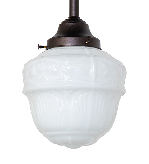Restore the past with this always fashionable early electric reproduction Rochelle ceiling fixture. The handsome pendant is finished in Mahogany Bronze with a floral and enhanced with a beautifully embossed White Schoolhouse Glass shade. This vintage lighting features a refined yet consistent, distinctive style that originated in traditional schoolhouses and public buildings in the early 1920s. The pendant design is perfect for entryways and lobbies in structures from Wells, Maine, to Columbia County, New York, to Canaan, Pennsylvania. The Revival Schoolhouse Mini Pendant is included in our American-designed, handcrafted Schoolhouse Lighting Collection. UL & cUL listed for dry and damp locations.