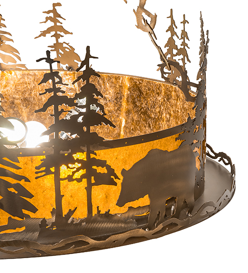 A mighty Bear wanders by a lake in the woods among the Tall Pine trees in this Nature-inspired inverted pendant. The stunning fixture features a Bear and woodland lake design in an Antique Copper finish on an Amber Mica lens with a matching bottom diffuser. The overall height ranges from 42 to 80 inches, as the chain length can be easily adjusted in the field to accommodate your specific lighting needs. The ceiling pendant is ideal for illuminating dining tables and entryways in fine homes from Jackson Hole, Wyoming, to Bozeman, Montana, to Barter Island, Alaska. The Bear at Lake Inverted Pendant is included in our American-made, American-designed, handcrafted Wildlife Collection and manufactured in Yorkville, New York. UL and cUL listed for dry and damp locations.