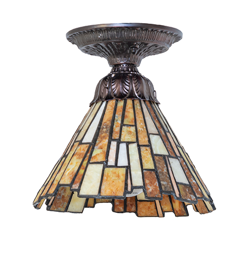A stunning ceiling fixture features thinly carved and polished natural Jadestone in earthy tones of Moss Green, Tan, Ivory, and Coral that become luminescent in this unique, tile-patterned shade. The stone shade is crafted using the same famous Meyda copper foil process used to create Tiffany-style stained glass shades. The fixture is enhanced with a Mahogany Bronze finish. This ceiling fixture is an excellent fit in dining areas, living spaces, and corridors in residential, hospitality, and commercial settings. The overall height can be adjusted by combining the four stem lengths that are included: 6-inch, 12-inch, 16-inch, and 24-inch in any combination to achieve the desired drop from the ceiling. The Delta Jadestone Flush Mount is featured in our American-made, handcrafted Jadestone Collection. The fixture is UL and cUL listed for dry and damp locations. Each shade is a unique work of art with color variations based on natural ingredients inherent in the Jadestone.