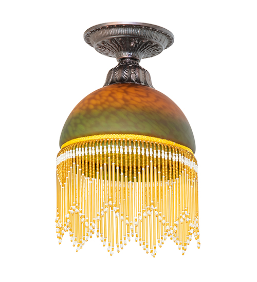 A charming, nostalgic ceiling fixture that is perfect for nearly any room. This Roussillon features a stunning Amber-Green Mottled Blown-Glass shade, color-coordinated with delicate Amber and Clear glass beaded fringe. Elegant cast metal hardware in a Mahogany Bronze finish embraces this Victorian-inspired shade. This ceiling fixture is perfect for placing above kitchen tables and throughout hallways in fine homes. The overall height can be adjusted by combining the four stem lengths that are included: 6-inch, 12-inch, 16-inch, and 24-inch, in any combination to achieve the desired drop from the ceiling. The Roussillon Flushmount is featured in our American-designed, handcrafted Boudoir Lighting Collection. UL and cUL listed for dry and damp locations. Each shade is a unique work of art with color variations based on natural ingredients inherent in the glass.