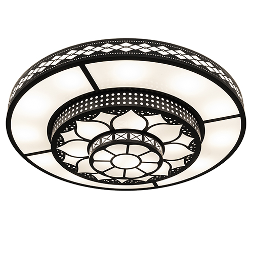 Like an enchanting flower budding with petals, this stunning design-layered fixture appears to bloom with beautiful light. Three tiers of intriguing designs are highlighted with Statuario Idalight bottom diffusers, which combine a broad range of geometric motifs with a floral style and are enhanced with a bold Solar Black finish. This massive ceiling fixture can be placed in entryways and large spaces in fine homes, casinos, restaurants, and hotels. The Binion Flush Mount is featured in our American-made, American-designed, handcrafted Deco Lighting Collection and is manufactured in Yorkville, New York. UL and cUL listed for dry and damp locations. This fixture is featured in the Horseshoe Tunica Casino in Robinsville, Mississippi.