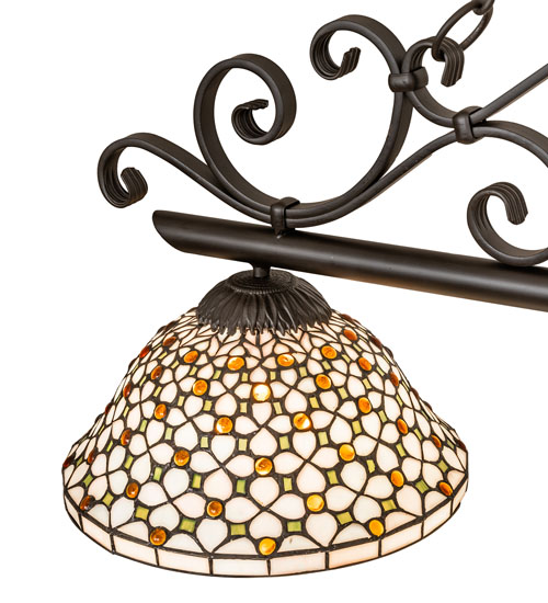 Three Clear Glass stained glass shades feature sparkling Emerald Green Diamond-shaped accents and Amber Jewel droplets in this elegant Victorian-style shade. The beautiful pendant features a stained glass shade created using the famous Meyda Tiffany copperfoil construction technique. The elaborate Made-to-Order scrollwork and hardware are hand-finished in a warm Oil Rubbed Bronze. The overall height ranges from 27 to 48 inches, and the chain can easily be adjusted in the field to meet your precise lighting needs. The pendant is ideal as an illuminating accent ceiling fixture above dining and kitchen tables, occasional tables, and other spaces in residential and hospitality settings. This lighting design is inspired by diamonds in fine jewelry retailers from Fifth Ave in New York City, to Palm Beach Gardens in Florida, to Rodeo Drive in Beverly Hills, California. The Diamond & Jewel Island Pendant is featured in our American-made, American-designed, handcrafted Stained Glass Lighting Collection. UL and cUL listed for dry and damp locations. Each shade is a unique work of art with color variations based on natural ingredients inherent in the glass.