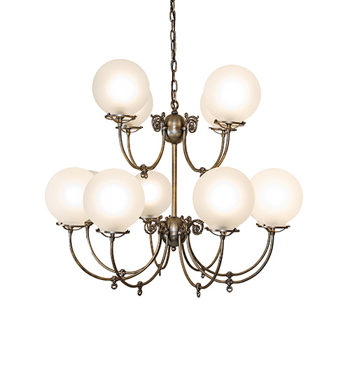 Combining the revival look of gas and electric reproductions, this magnificent chandelier offers an eye-catching look with 12 stunning Globe-styled elements offered in Clear Frosted Glass. An elegant frame, hardware, and scrollwork are featured in a luxurious Antique Brass. The decorative accents resemble authentic paddle switches used in antique lighting. The chandelier is ideal for illuminating lobbies and patron service areas in restaurants and retailers. The overall height of this pendant ranges from 38 to 84 inches, as the chain length can be easily adjusted on location to accommodate your specific lighting application needs. The Revival Gas & Electric 12 Light Chandelier is included in our American-designed handcrafted Revival Collection. UL and cUL are listed for dry and damp locations. The fixture is featured in the Splendid Restaurant in New York City and was specified by Cassidy Renee Studios.