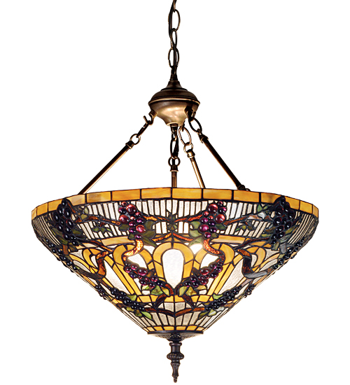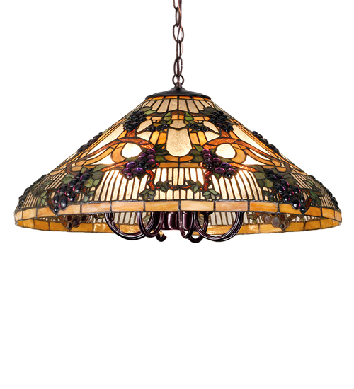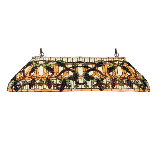 Bring sunny vineyards to your own home or business with this lovely Meyda Original two-light ceiling fixture. Radiant Concord Purple jewels, Vineyard Green leaves, and glistening dew kissed Bark Brown vines wrap around Golden Sunshine banded shades. The stained glass shades are created using the famous Meyda Tiffany copperfoil construction process and are perfect for spotlighting surfaces or artwork on the walls. The shades are adjustable from 7.5 to 14 inches in overall height, with a width that adjusts from 7.5 to 14 inches. The ceiling fixture is enhanced with a Mahogany Bronze finish. It is ideal for illuminating a kitchen island, billiard/dining table, counter, or bar. The Jeweled Grape Semi-Flushmount is featured in the American-designed, handcrafted Stained Glass Lighting Collection. UL and cUL listed for dry and damp locations.