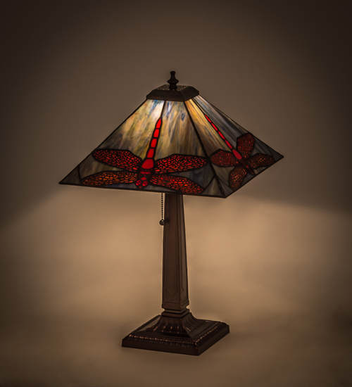 Scarlet Dragonflies with Ruby eyes dive downward against a cloud filled Aurora Midnight sky streaked with a full spectrum of colors. The exceptional stained art glass used shade has unique tones in each piece, just as in nature. Each piece of glass is hand cut and copper foiled in the famous Meyda Tiffany tradition. The Mission style shade pairs well with a mini table lamp base, or matches with hardware to create a wall or ceiling fixture such as 154290. The Prairie Dragonfly Shade is featured in our American designed, handcrafted Prairie Lighting Collection. Each piece is a unique work of art with color variations based on natural ingredients inherent in the glass. Contact us if color matching is critical when ordering multiple items.