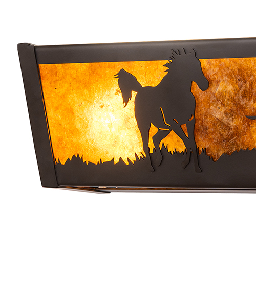 Running Horses are featured galloping along the prairie while the sun rises in the background in this dramatic lighting design. Beautiful ambient lighting is projected through an Amber Mica lens, which is enhanced with a frame and hardware in a stunning Oil Rubbed Bronze finish. Perfect as a vanity light in a fine bath or a wall sconce in a corridor. The Running Horses Vanity Light is included in our American-made, American-designed, handcrafted Western Lighting Collection, which is manufactured in Yorkville, New York. UL and cUL listed for dry and damp locations.