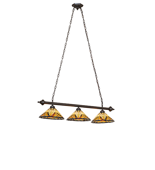 Like gazing out your window across the warm desert at sunset... Interlocking tiles of Sandstone Beige glow behind the sun-glistening Orange, Amber Green, and Brown rays on these stained glass shades. A Bark Brown border surrounds this stunning motif. Three stunning Nuevo Mission shades are created using the famous Meyda Tiffany copperfoil construction method and embraced with Mahogany Bronze hardware. The oblong fixture is ideal for illuminating islands, billiard tables, counters, bars, and other residential and hospitality spaces. The overall height ranges from 22 to 62 inches, as the chain can be easily adjusted on location to meet your lighting requirements. The Nuevo Mission 3 Light Island Pendant is featured in our American-designed, handmade Southwestern Stained Glass Series. UL and cUL listed for dry and damp locations. Each shade is a unique work of art with color variations based on natural ingredients inherent in the glass.