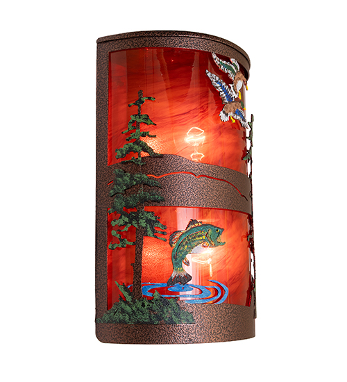 The call of the wild comes to light with Bass leaping out of a mountain lake while Mallard Ducks are soaring high towards the heavens above the Tall Pine Trees and Grass as the morning sun rises in the background. Beautiful ambient light shines through a Maduro Idalight lens, which is enhanced with our New Copper Vein powder coat and Hand-painted decorative accents in Blue and Green hues. The ADA-Compliant wall piece for illuminating a dining area or foyer in residential, hospitality, and commercial spaces. See the complementary 8" Wide Bass & Mallard Left Wall Sconce (#284058). The Bass & Mallard Wall Sconces are included in our American-made, American-designed, handcrafted Wildlife Lighting Collection. This fixture is manufactured in Yorkville, New York. UL and cUL listed for dry and damp locations. Upstate New York's adventurous playground, known as the Adirondack Mountains, with its many breathtaking forests, lakes, and rivers, is the spiritual birthplace of Meyda and inspires our rustic-themed collections.