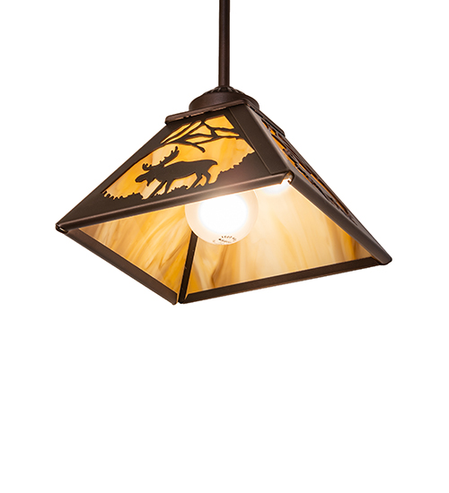 This nature-inspired mini pendant depicts a majestic Moose meandering through an enchanting forest as the early morning mist begins to clear, creating a beautiful spectacle with the rising sun. A power animal symbolizing confidence, wisdom, longevity, and steadfastness, the Moose is portrayed in all its glory in a Mahogany Bronze finish. The stunning shade features a beautiful Travertine Idalight lens with a dramatic Moose silhouette. Place the mini pendants in a group above a bar, kitchen island, or dining table to create a beautiful design statement. The Moose at Dawn Mini Pendant is included in the American-made, American-designed, handcrafted Wildlife Collection, which is manufactured in Yorkville, New York. The fixture is UL and cUL listed for dry and damp locations. Upstate New York's adventurous playland, known as the Adirondack Mountains, with its many breathtaking forests, lakes, and rivers, is the spiritual birthplace of Meyda and inspires our rustic-themed collections.