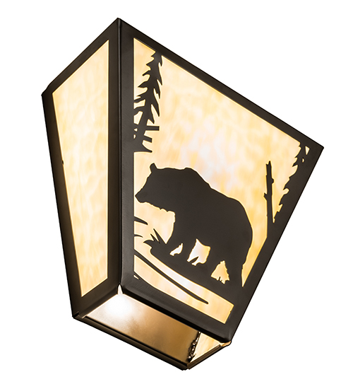 A majestic Bear meanders alongside a mountain creek, creating an image that would make Mother Nature proud. Pleasant ambient light projects through a Beige Art Glass diffuser, complemented with a frame and hardware featured in a Timeless Bronze finish. This fixture is complemented with the matching Bear Creek Right Wall Sconce, model 243391. The Bear Creek Wall Sconces are included in our American-made, American-designed, handcrafted Nature Inspired Lighting Collection and are manufactured in Yorkville, NY. UL and cUL listed for dry and damp locations. Upstate New York's adventurous playland, known as the Adirondack Mountains, with its many breathtaking forests, lakes, and rivers, is the spiritual birthplace of Meyda and inspires our rustic-themed collections.