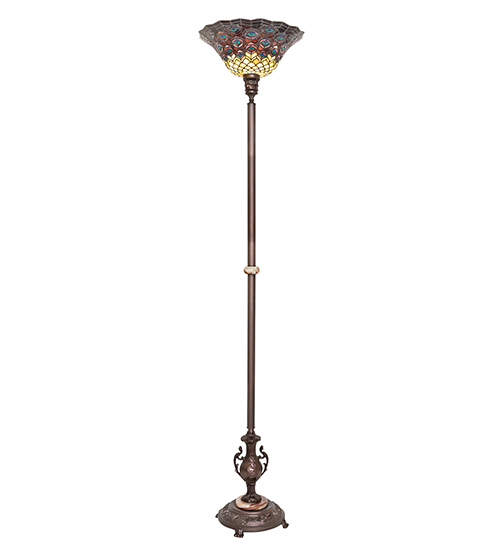 As distinctive as a beautiful Peacock's feathers, no two shades will ever be the same as their individuality can be as remarkably unique as their personality. This artistic creation utilizes swirling opalescent art glass background combinations including Beige Amber, Yellow Pinks, Red Purples, Golden Blues and Greens, Ivories, Bluish Whites, Turquoise Blues, Periwinkle, Olive and Spring Greens, Pale Yellow, Amethyst, Emerald and Topaz. The eye of the plumage design reveals Purples, Pastel Blues, Teals, Cobalt and Ivories. Individual pieces of glass are hand cut and wrapped using Meyda Tiffany's famous copperfoil construction. Each shade is a unique work of art with color variations based on natural ingredients inherent in the glass.